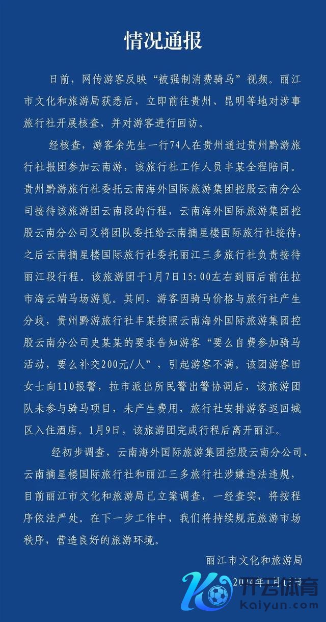 1月16日,极目新闻记者从丽江市委宣传部获悉,针对强制条目蹧跶骑马一事的访谒效果已经出炉。经核查,反馈情况的旅客余先生一转74东说念主在贵州通过贵州黔游旅行社报团进入云南游,该旅行社使命主说念主员丰某全程奉陪。贵州黔游旅行社请托云南国番邦际旅游集团控股云南分公司招待该旅游团云南段的行程,云南国番邦际旅游集团控股云南分公司又将团队请托给云南摘星楼国际旅行社招待,云南摘星楼国际旅行社又请托丽江三多旅行社安逸招待丽江段行程。