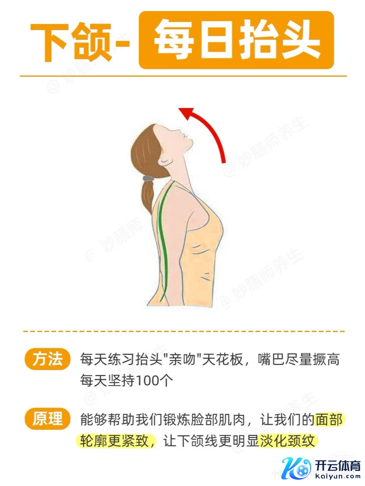- 下颌------逐日昂首 范例:每天进修昂首"亲吻"天花板,嘴巴尽量撅高,宝石100下 get小v脸:教练脸部肌肉,让咱们的面部玄虚更紧致,让下颌线更昭彰淡化颈纹 .