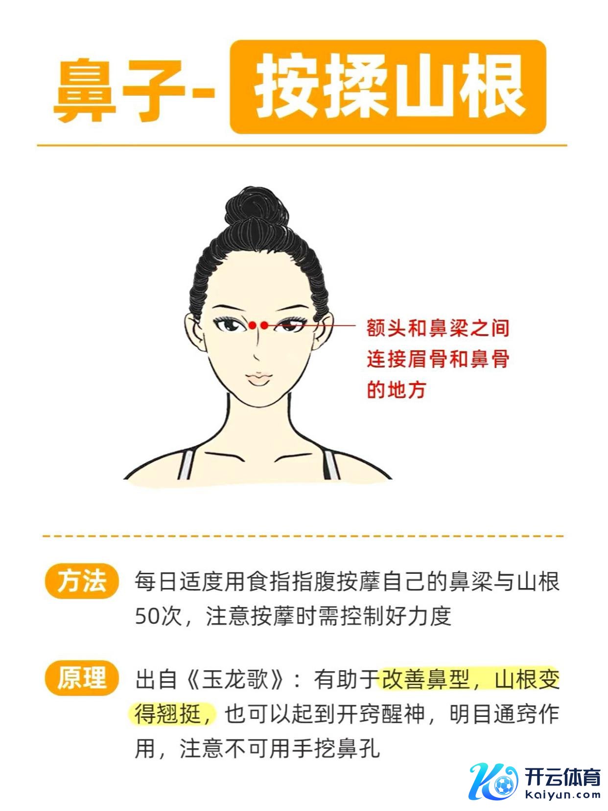 鼻子------按揉山根 范例:用食指指腹推拿我方的鼻梁与山根50次,注视推拿时需限制好力度 出自《玉龙歌》:有助于改善鼻型,山根变得翘挺,也不错起到开窍醒神,明目通窍作用 .