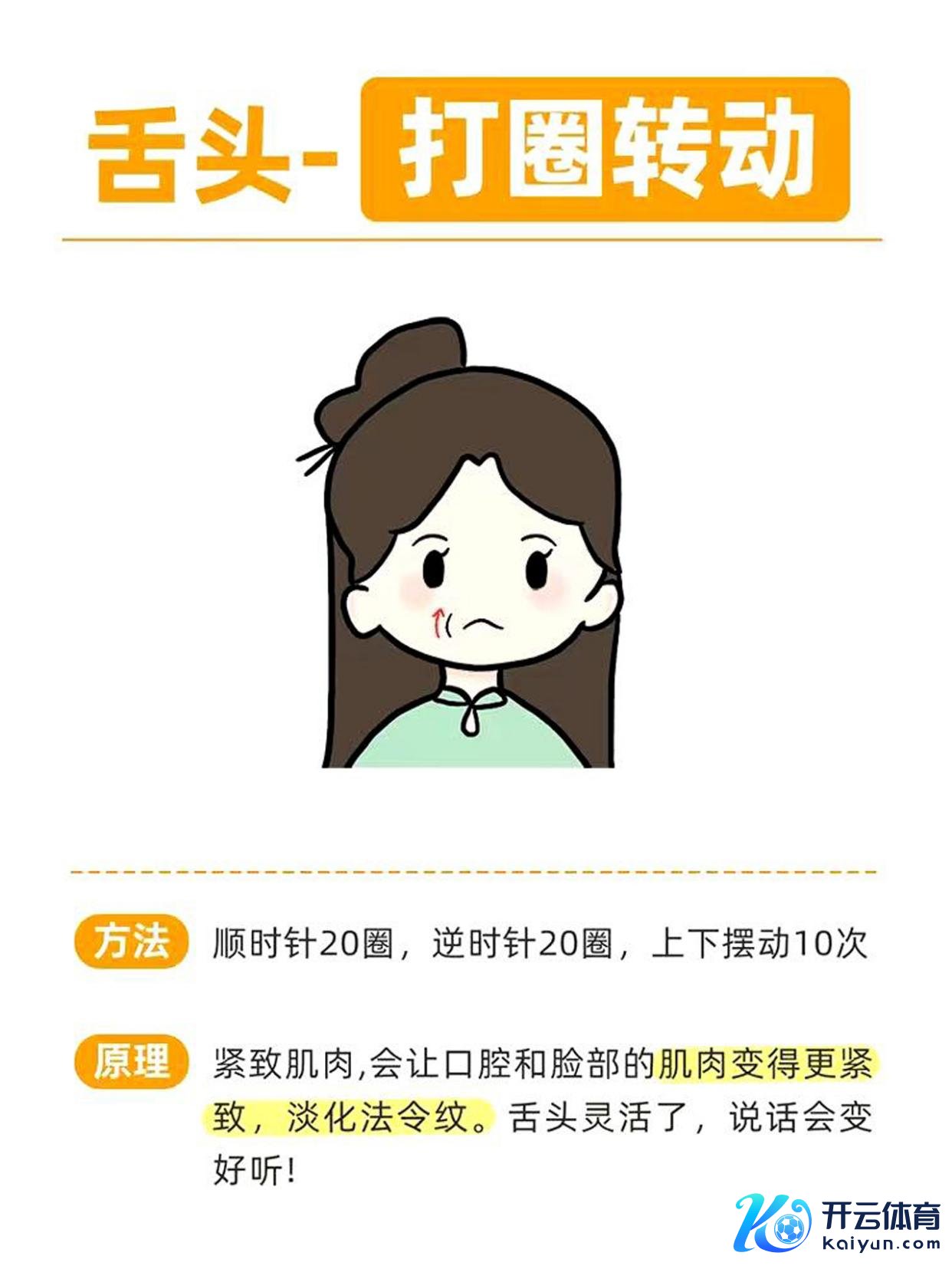 舌头------打圈动掸 范例:顺时针20圈,逆时针20圈,障碍舞动10次 紧致肌肉:这个手脚会让口腔和脸部的肌肉变得更紧致,舌头生动了,谈话也会变顺耳!