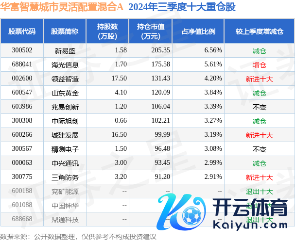 华富机灵城市纯真建树羼杂A为羼杂型-纯真基金,凭证最新一期基金季报披露,该基金金钱建树:股票占净值比94.08%,无债券类金钱,现款占净值比5.52%。基金十大重仓股如下: