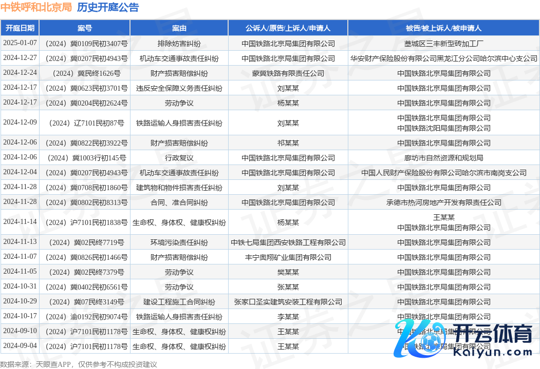 本站音讯,字据天眼查APP露馅,近日公布了一则中国铁路北京局集团有限公司行动原告/上诉东谈主的开庭公告,预防推行如下: